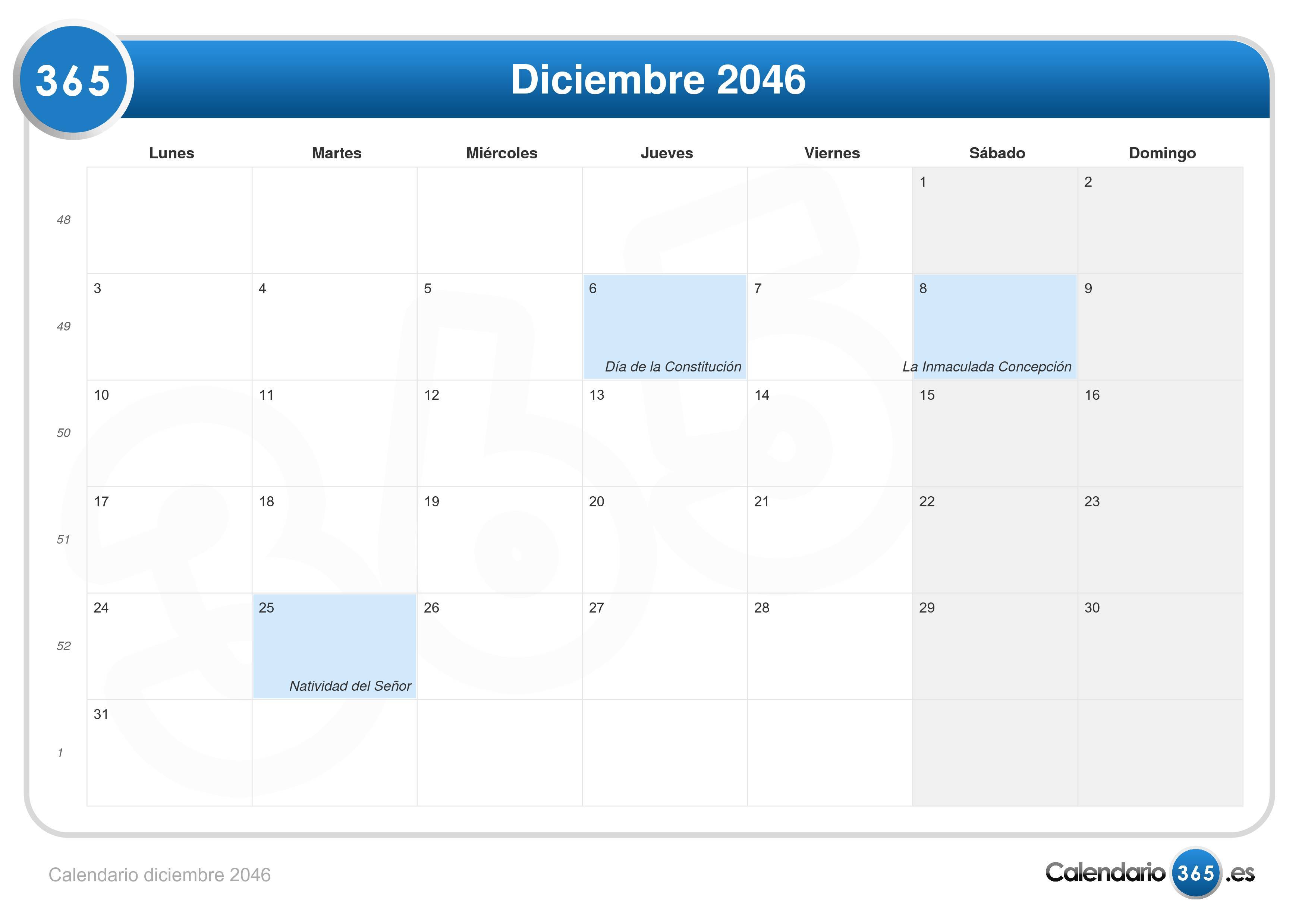 Calendario diciembre 2046