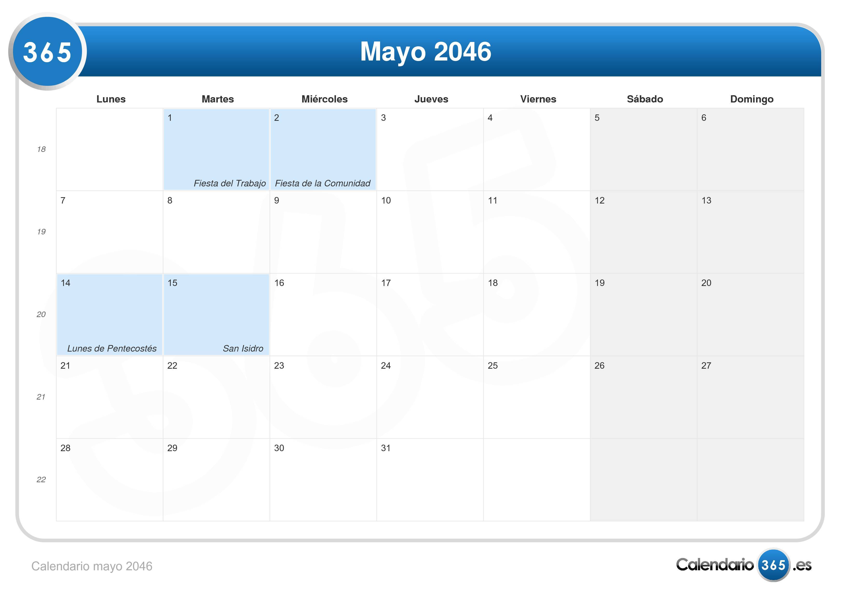 Consulta aquí el calendario mensual de mayo del 2046. Este incluye los números de las semanas.| 1 mayo | Fiesta del Trabajo |